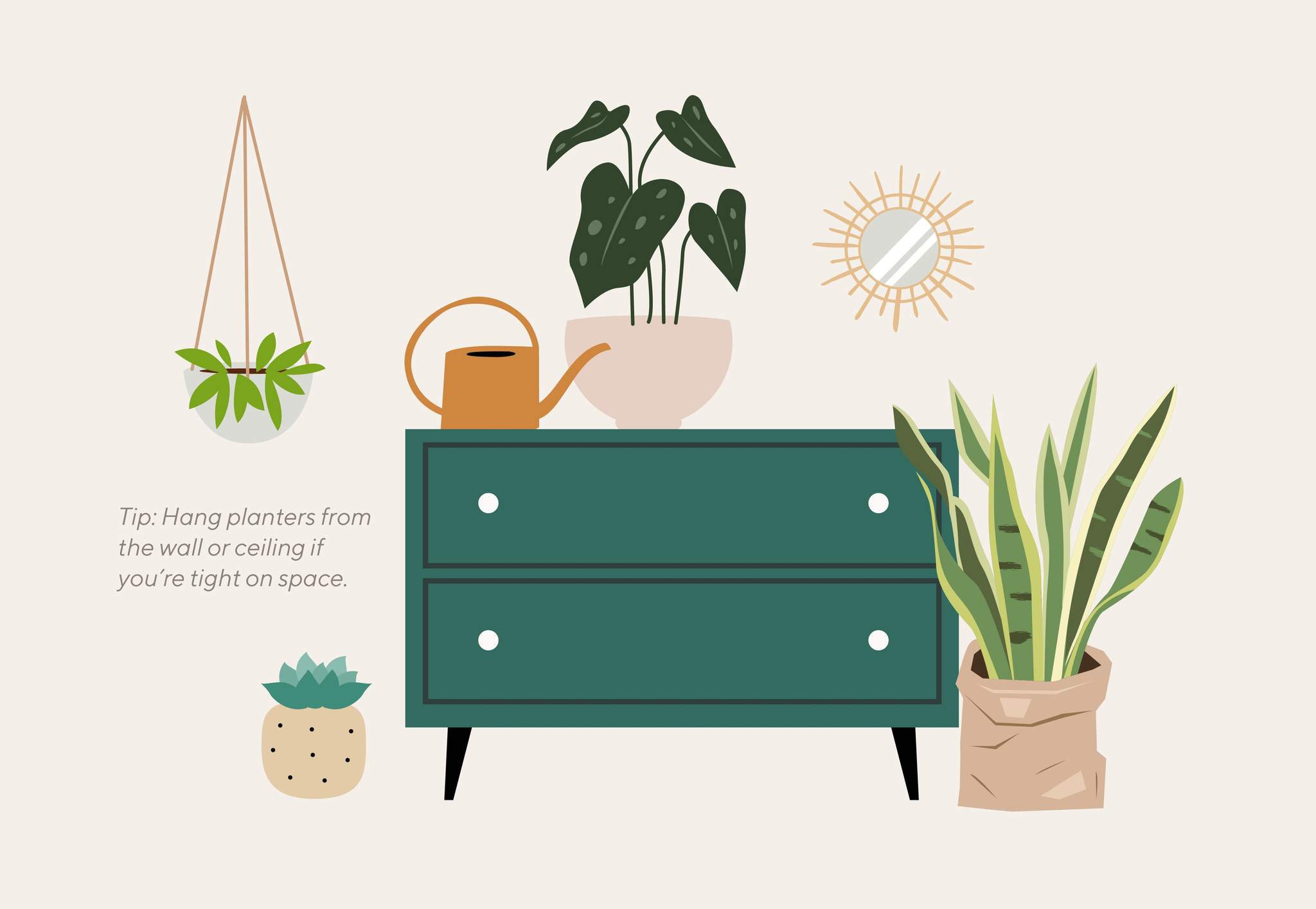 Spider Plant—these trailing beauties tolerate low light conditions, thrive in hanging pots, and don’t require much water.